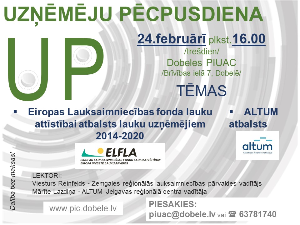 Tālr. 63781739 (sekretāre 63781740) Mob. 25449330 (birojs), e-pasts piuac@dobele.lv