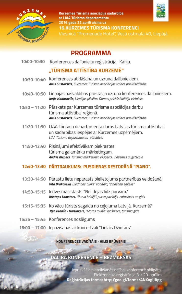 Kurzemes Tūrisma asociācija sadarbībā ar LIAA Tūrisma departamentu 2016. gada 22. aprīlī plkst. 10:00 aicina uz 16. Kurzemes tūrisma konferenci viesnīcā "Promenade Hotel", Vecā ostmala 40, Liepāja.