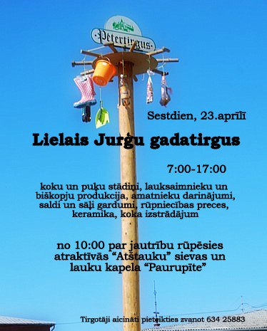 No 10:00 par jautrību rūpēsies atraktīvās sievas no “Atštaukām” un kapela “Paurupīte”. Ar dziesmām, mūziku un lustēm sagaidīsim Jurģu dienu, būs apdziedāšanās, atrakcijas un umurkumurs.