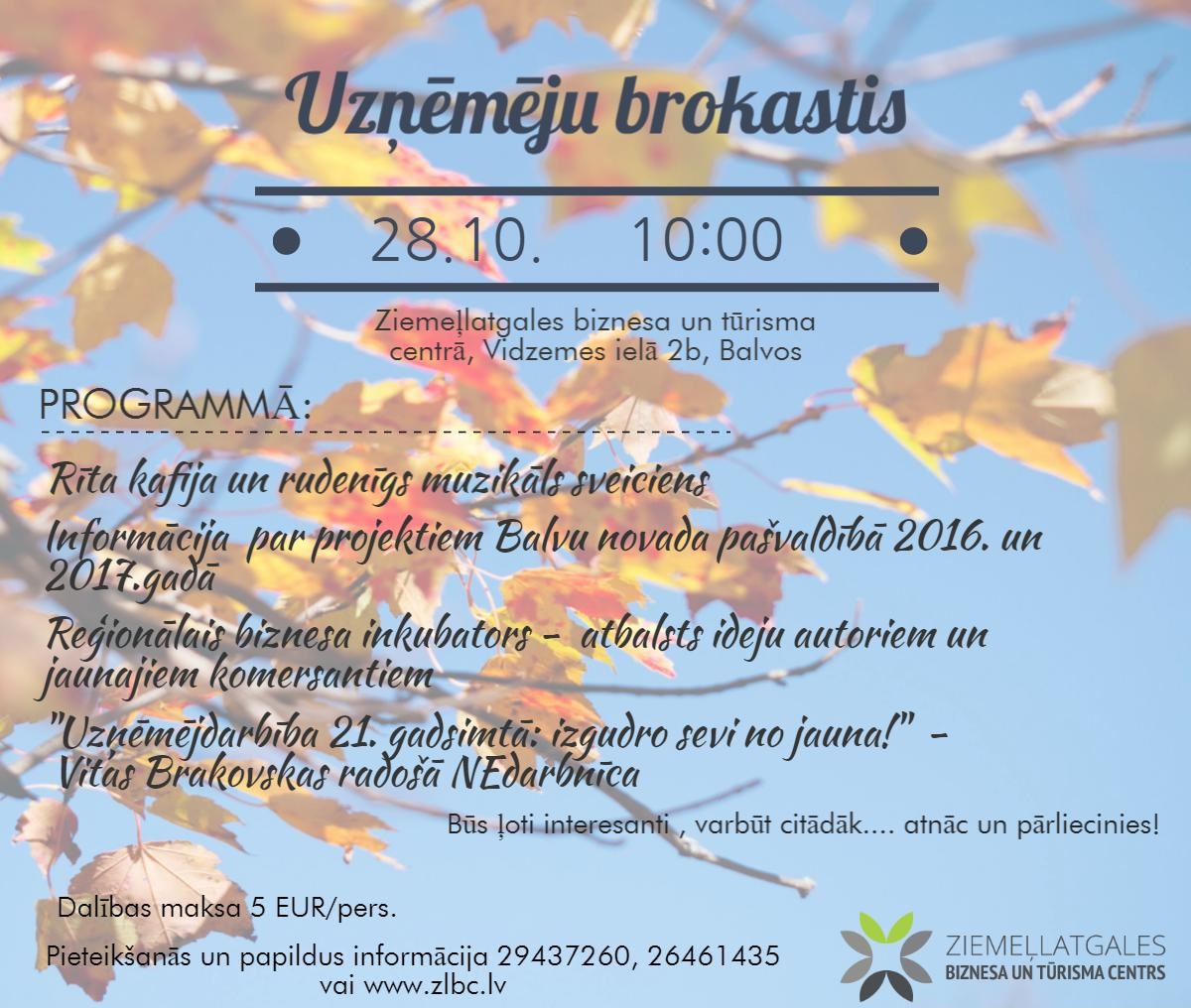 Aicina apmeklēt pasākumu "Uzņēmēju brokastis", kas notiks Ziemeļlatgales biznesa un tūrisma centrā Balvos 28. oktobrī. Pieteikšanās obligāta.