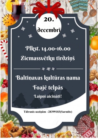 Aicina apmeklēt Ziemassvētku tirdziņu Baltinavā, kurš norisināsies 20. decembrī no plkst. 14.00 - 16. 00 Baltinavas kultūras namā. Tālrunis uzziņām - Sarmīte 28399183