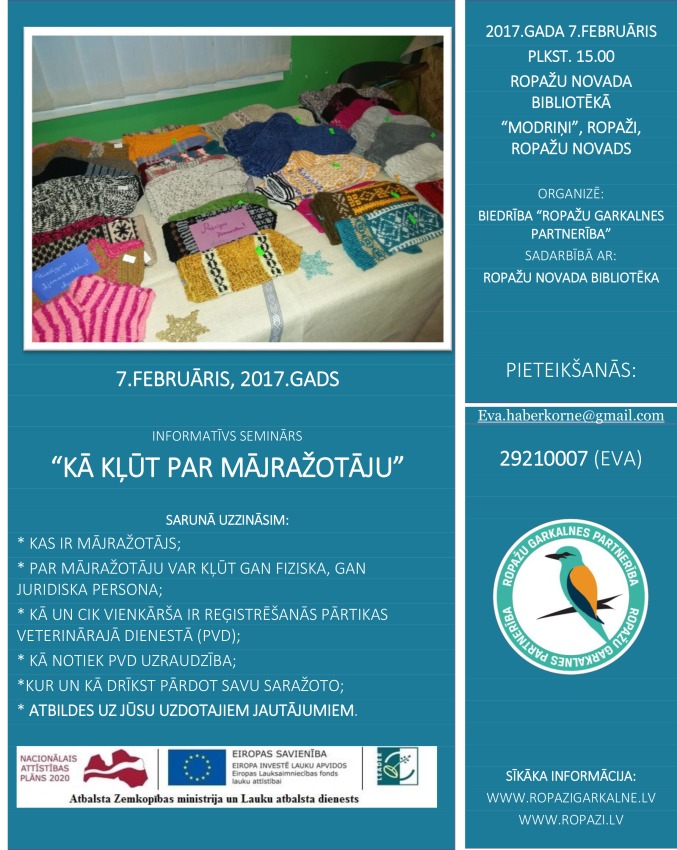 7.februārī plkst.15.00 Ropažu novada bibliotēkā, "Modriņi", Ropažos, biedrība "Ropažu Garkalnes partnerība" sadarbībā ar Ropažu novada bibliotēku organizē semināru "Kā kļūt par mājražotāju". Informatīvajā seminārā būs iespējams uzzināt, kas ir mājražotājs, kas var kļūt par mājražotāju, cik vienkārši ir iespējams piereģistrēties Pārtikas Veterinārajā dienestā un, kur drīkst pārdot savu saražoto produkciju.