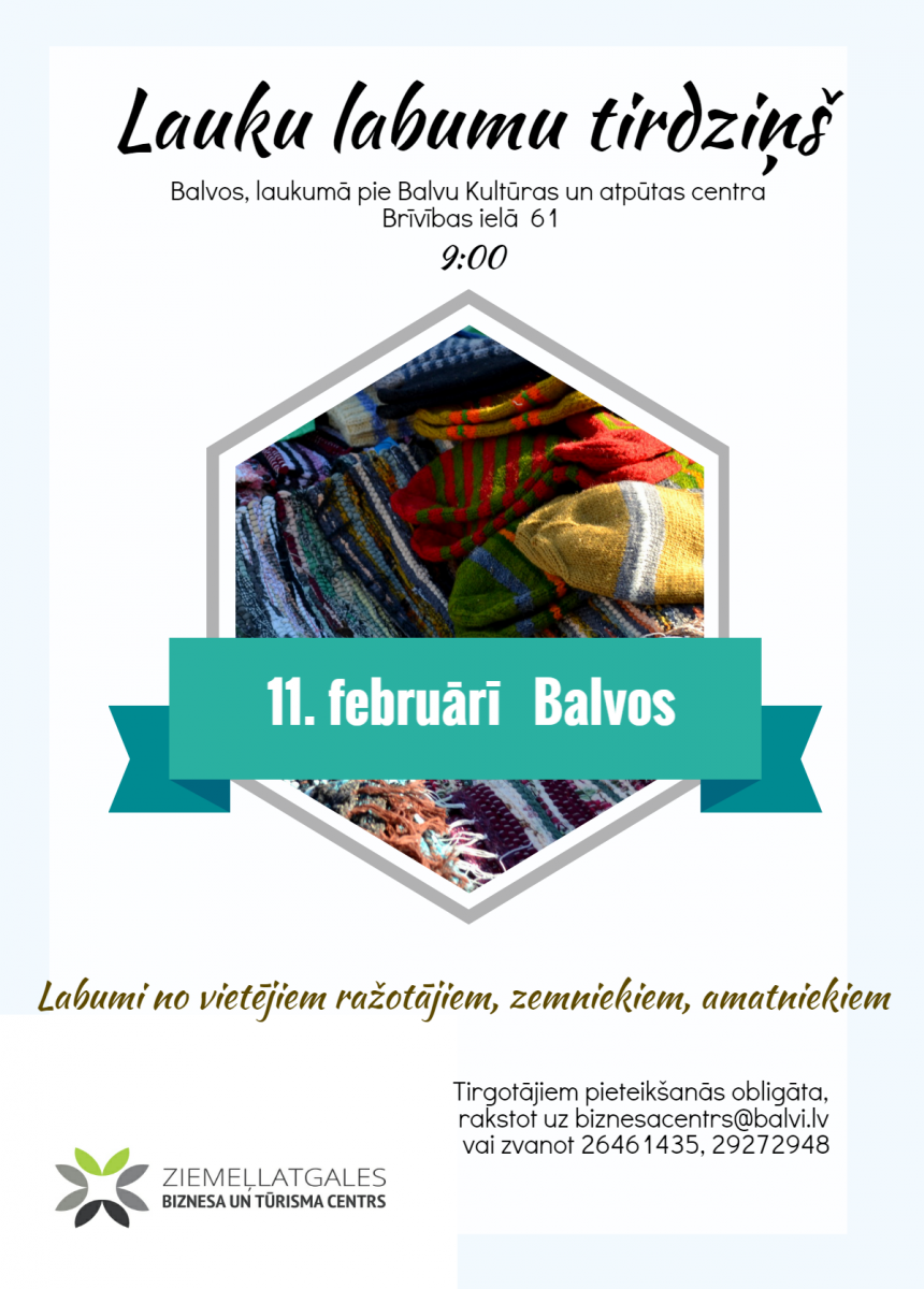 11. februārī Balvos, laukumā pie Balvu Kultūras un atpūtas centra notiks tradicionālais lauku labumu tirdziņš. Aicinām ikvienu apmeklēt tirdziņu, lai iegādātos dažādus lauku labumus un amatniecības izstrādājumus no zemniekiem, mājražotājiem un amatu meistariem!