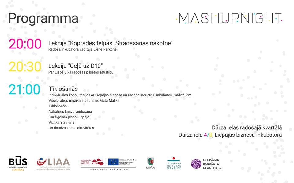 Ar prieku izziņojam pasākuma “Mashup* Night Liepaja 2017” programmu, lai kopā nosvinētu vairākus notikumus. 16. februārī atklāsim LIAA Liepājas biznesa inkubatora koprades telpu radošo industriju kvartālā Dārza ielā, iesildīsimies Latvijas lielākās radošo industriju konferences “Subject: Creativity” norisei Liepājā, kā arī iepazīsimies ar Liepājas radošo industriju centra “D10” attīstības plāniem. Un, protams - tīklošanās, konsultācijas, ideju apmaiņa, neformāls burziņš un vēl, un vēl.