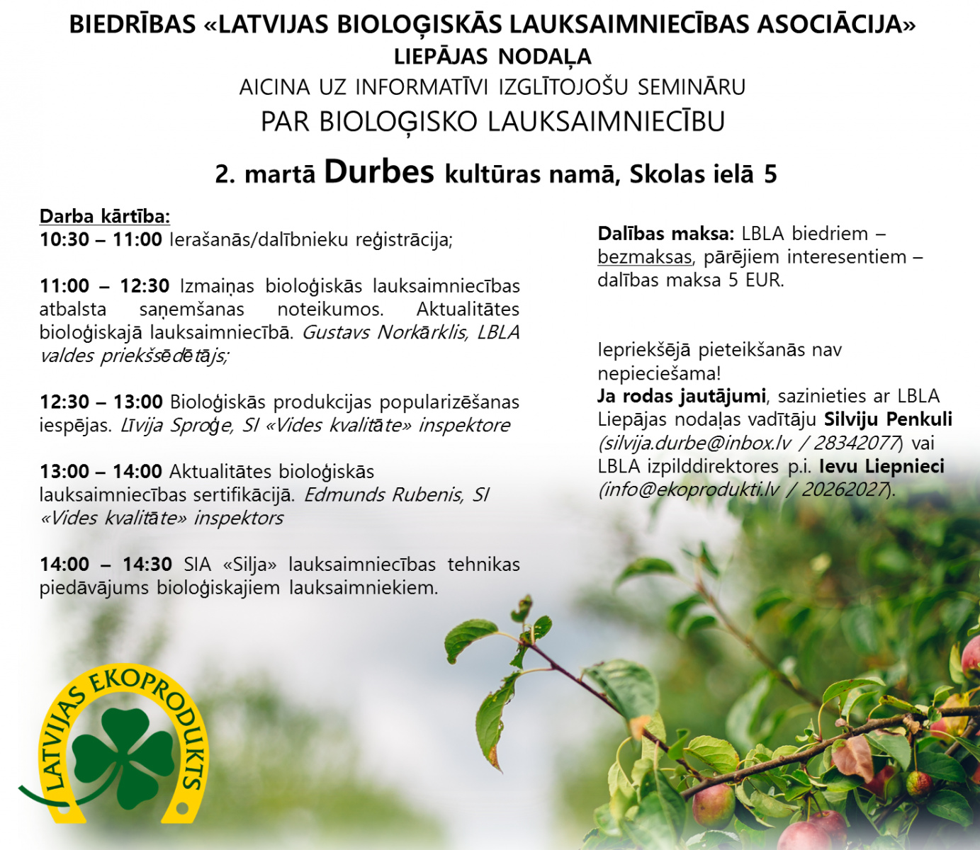 Ja rodas jautājumi, sazinieties ar LBLA Liepājas nodaļas vadītāju Silviju Penkuli (silvija.durbe@inbox.lv / 28342077) vai LBLA izpilddirektores p.i. Ievu Liepnieci (info@ekoprodukti.lv/ 20262027 ).