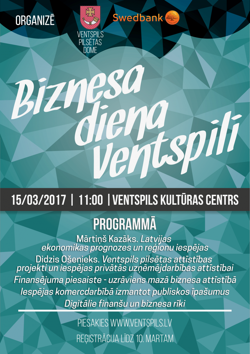 Šā gada 15. martā Ventspils pilsētas domes Kultūras centra Mazajā zālē no plkst. 11.00 norisināsies Biznesa diena. Pasākuma mērķis ir gan esošajiem uzņēmējiem, gan tiem, kuri vēl tikai plāno uzsākt uzņēmējdarbību, ļaut izzināt jaunākās biznesa iespējas Ventspilī un tās apkārtnē, kā arī iepazīties ar aktuālajām tendencēm uzņēmuma pārvaldības ikdienā.