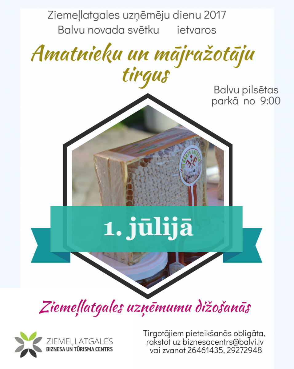 1. jūlijā no plkst. 9:00 Balvos pilsētas parkā notiks amatnieku un mājražotāju tirgus, kā arī Ziemeļlatgales uzņēmumu “dižošanās” jeb izstāde Balvu novada svētku un Ziemeļlatgales uzņēmēju dienu ietvaros.