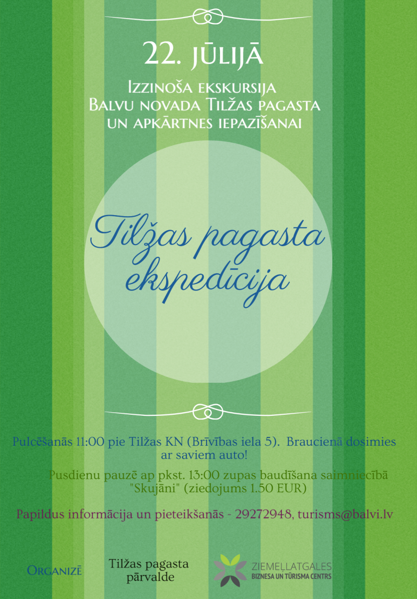 Šī gada 22. jūlijā – Tilžas pagasta svētku dienā aicinām doties braucienā “Tilžas pagasta ekspedīcija”. Pasākums tiek organizēts kā izzinoša ekskursija, kurā dalībnieki brauc ar savām automašīnām. Dienas laikā tiks apmeklētas interesantas vietas, kas atklās Balvu novada Tilžas pagasta un apkārtnes vēsturi, dabu un ļaus iepazīt čaklos pagasta cilvēkus. Vietējā gida lomā - tilženiete Aina Rakstiņa.