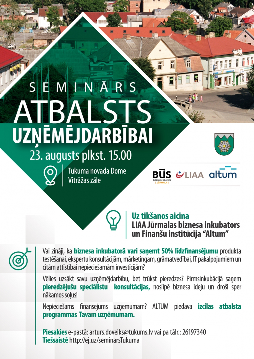 Tukuma novada Dome, LIAA Jūrmalas biznesa inkubators un Finanšu institūcija “Altum” aicina uz tikšanos!