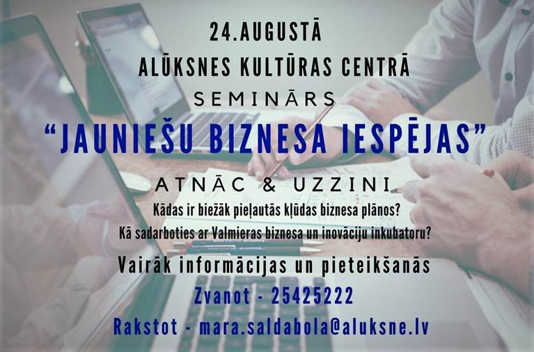 Alūksnes Kultūras centrā notiks seminārs “Jauniešu biznesa iespējas”. Semināra laikā būs iespēja uzzināt par biežāk pieļautajām kļūdām biznesa plānos un, kā sadarboties ar Valmieras biznesa un inovāciju inkubatoru.