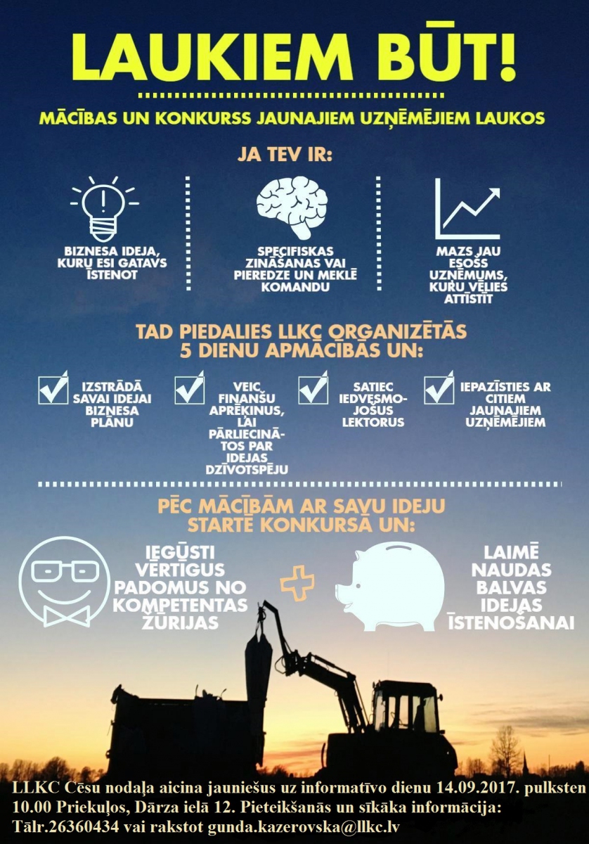LLKC Cēsu nodaļa aicina jauniešus uz informatīvo dienu Valsts lauku tīkla aktivitātei "Atbalsts lauku jauniešiem uzņēmējdarbības veicināšanai".