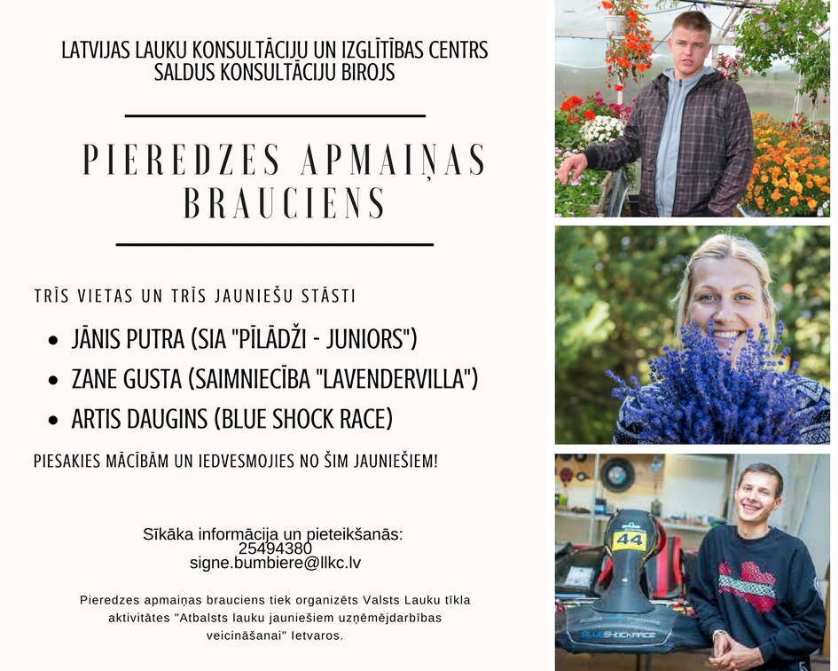 Pieredzes apmaiņas braucienu noslēgsim Liepājā, pie SIA "Blue Shock Race" īpašnieka un vadītāja Arta Daugina. Artis pastāstīs par to, ka arī jaunietis no laukiem (Saldus novada, Kalniem) var paveikt un sasniegt daudz, viņš pilnīgi noteikti ir piemērs tam, ka “Tu vari vairāk!”, kas arī ir jauniešu mācību moto. Viņa vadītais uzņēmums nodarbojas ar elektrotransportlīdzekļu ražošanu. Tikšanās ar Arti notiks Liepājas Elektrokartingu hallē, kas ir pirmā halle Latvijā, kurā elektrisko jaudu var izbaudīt gan bērni, gan pieaugušie.