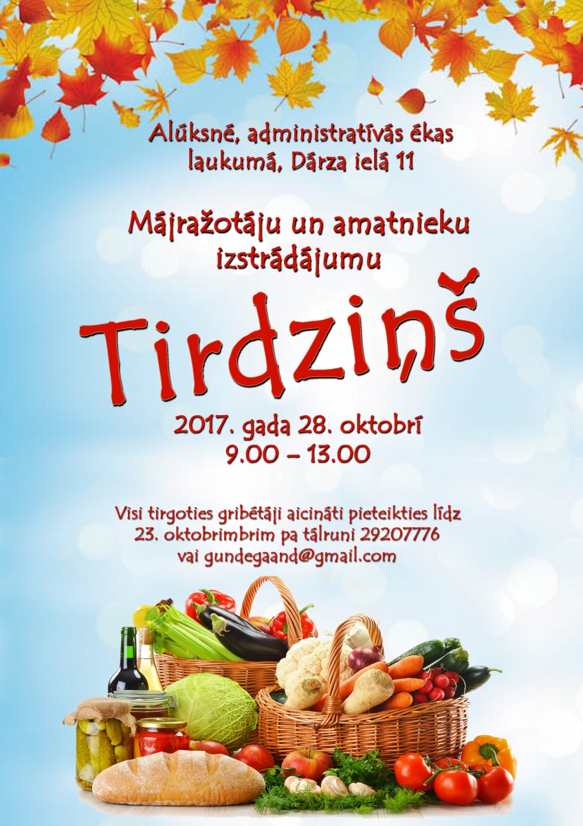 Datums: 28. Oktobris, 2017Reģions: Alūksnes novadsVieta: Administratīvās ēkas laukumsAdrese: Skatīt karti lielākā izmērā Nozare: UzņēmējdarbībaVisi tirgoties gribētāji aicināti pieteikties līdz 23.oktobrim. Kontaktinformācija: Gundega Andersone mob.29207776, gundegaand@gmail.comReģions filtram: Alūksnes novads