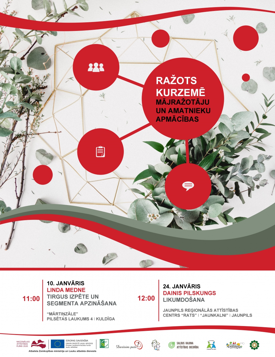 Apmācības mājražotājiem saistībā ar projektu "Mājražotāju un amatnieku potenciāla attīstība un tūrisma piedāvājuma "Ražots Kurzemē" izveide". 24.janvārī plkst.12:00 Jaunpils reģionālās attīstības centrā "Rats", "Jaunkalnos", Jaunpilī, Dainis Pilskungs vadīs mācības par likumdošanu.