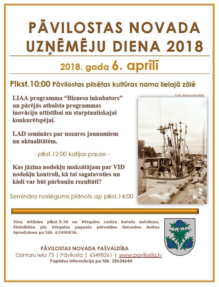 2018. gada 6. aprīlī plkst. 10:00 (līdz plkst. 14:00) Pāvilostas pilsētas kultūras nama lielajā zālē notiks "Pāvilostas novada uzņēmēju diena 2018".