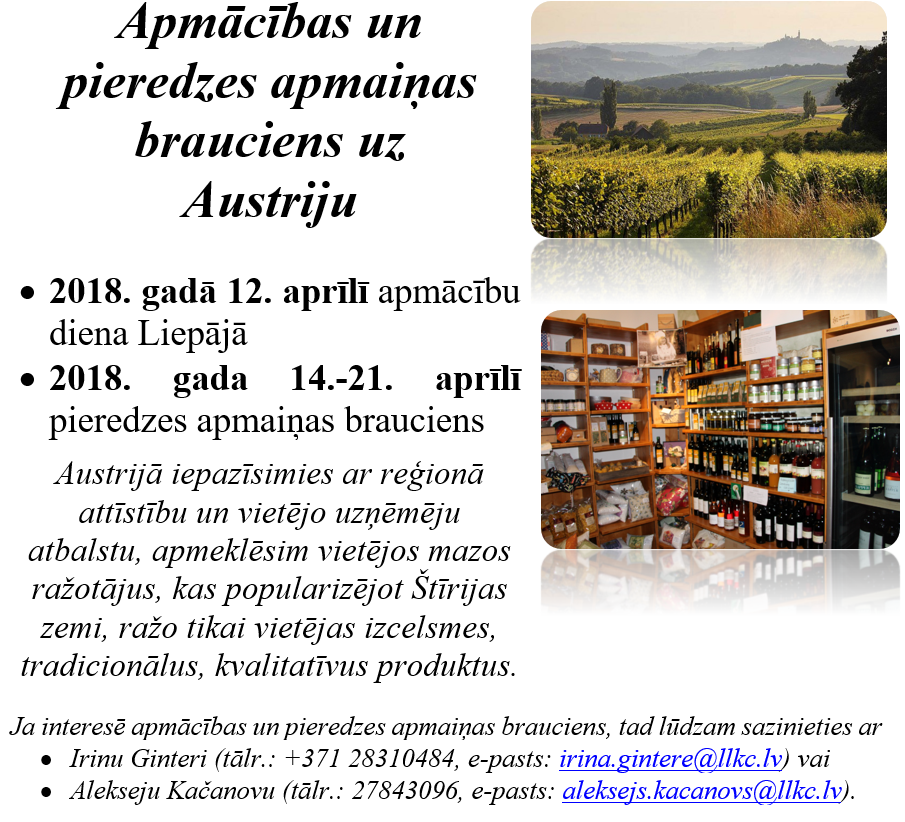 Ja interesē apmācības un pieredzes apmaiņas brauciens, tad lūdzam sazinieties ar Alekseju Kačanovu (tālr.: 27843096, e-pasts: aleksejs.kacanovs@llkc.lv) vai Irinu Ginteri (tālr.: +371 28310484, e-pasts: irina.gintere@llkc.lv).