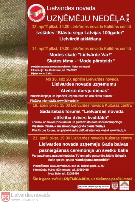 Lielvārdes novada pašvaldība sadarbībā ar Lielvārdes novada uzņēmēju biedrību un Lielvārdes Attīstības fondu no 13. līdz 21. aprīlim rīko Lielvārdes novada uzņēmēju nedēļu. Aicinām piedalīties iedzīvotājus, uzņēmējus, ikvienu interesentu!