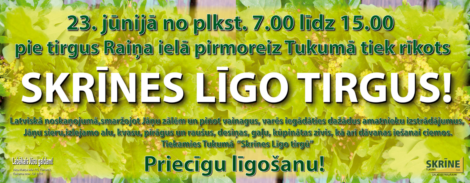 23.jūnijā no plkst. 7.00 līdz plkst. 15.00 pie tirgus Raiņa ielā pirmo reizi Tukumā tiek rīkots " Skrīnes Līgo tirgus!"