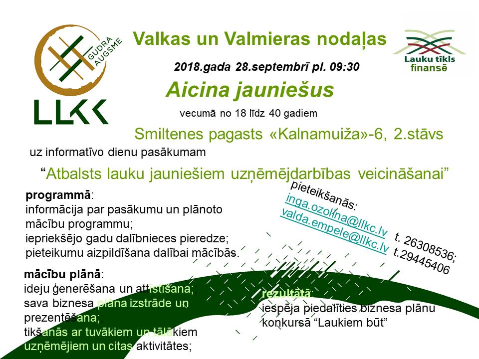 Valkas un Valmieras nodaļas 28. septembrī pl.9:30 aicina jauniešus (vecumā no 18-40 gadiem) uz informatīvo dienu pasākumam „Atbalsts lauku jauniešiem uzņēmējdarbības veicināšanai” , kas notiks Smiltenes novada, Smiltenes pagasta "Kalnamuižā"-6 ("vetu"mājas 2.stāvs)