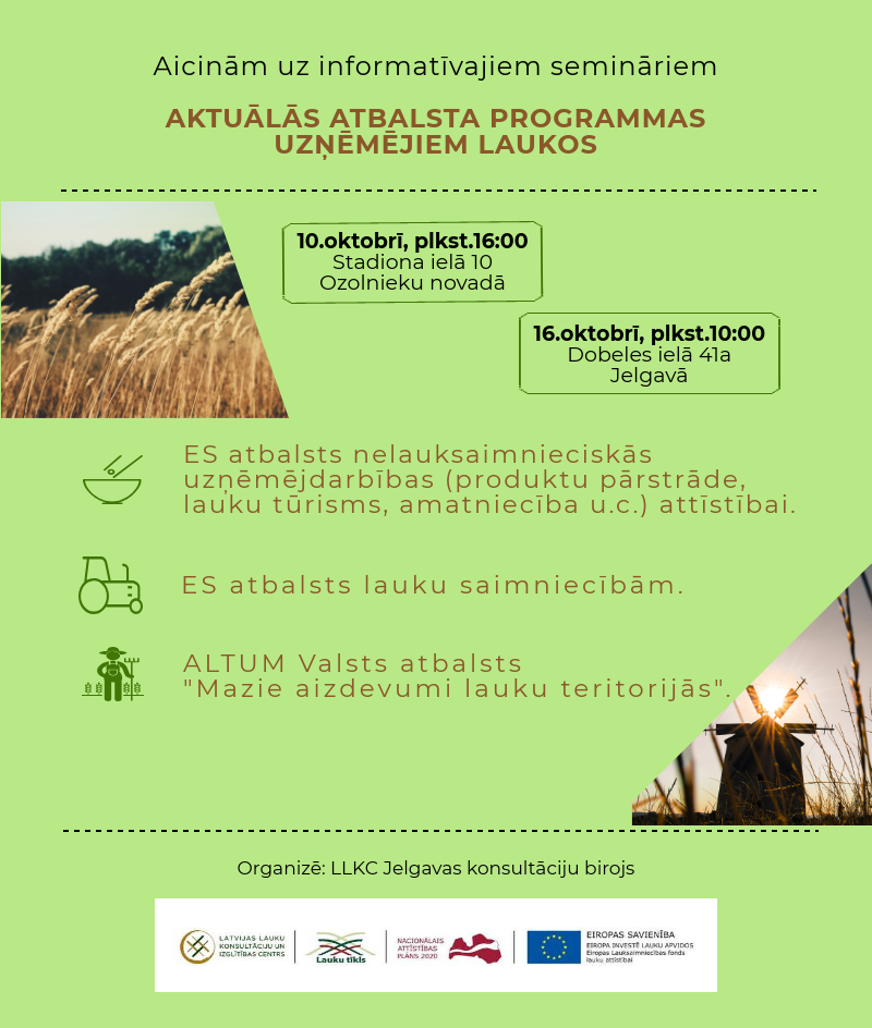 LLKC Jelgavas birojs aicina uz Informatīvo semināru par Aktuālajām atbalsta programmām uzņēmējiem lauku teritorijās.