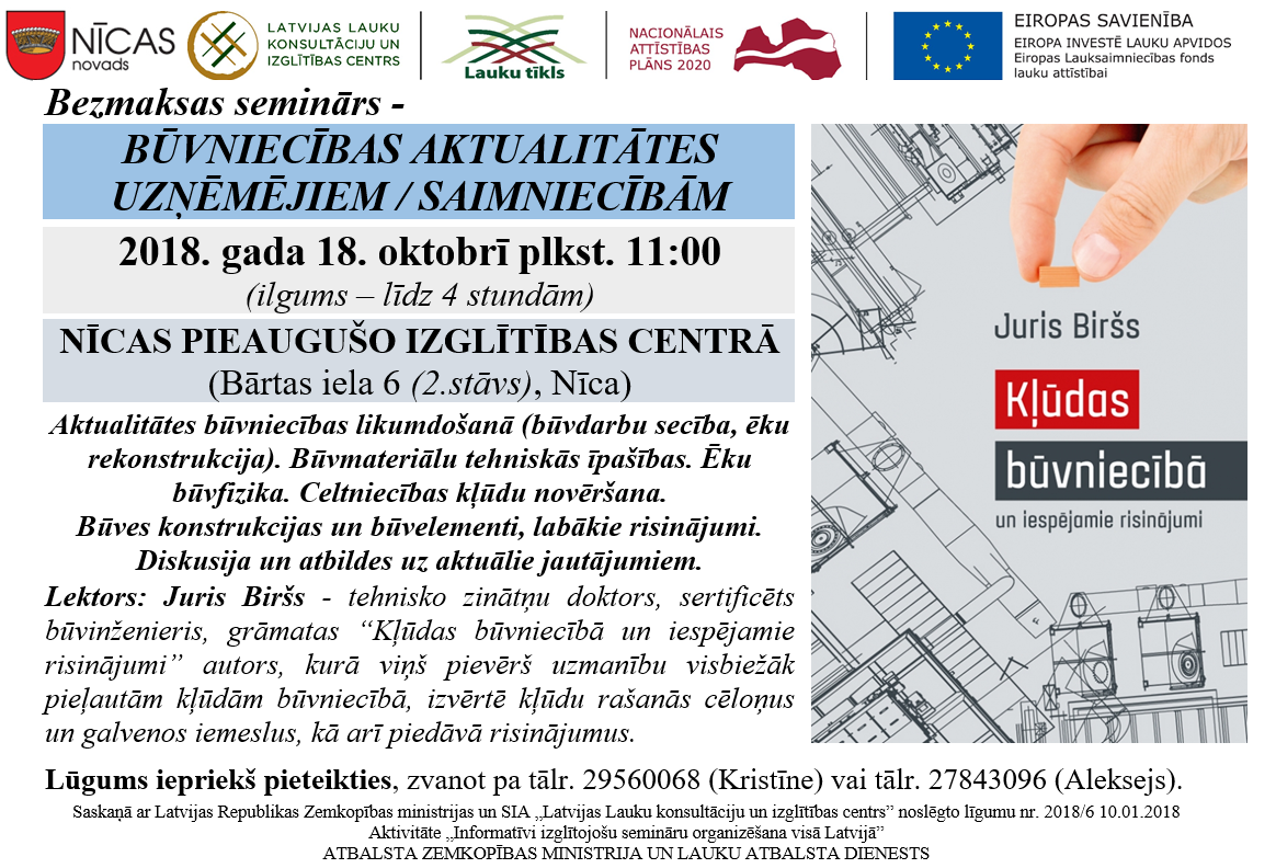 Nīca | 18. oktobris - bezmaksas seminārs par būvniecības aktualitātēm uzņēmējiem / saimniecībām (lektors: Juris Biršs)