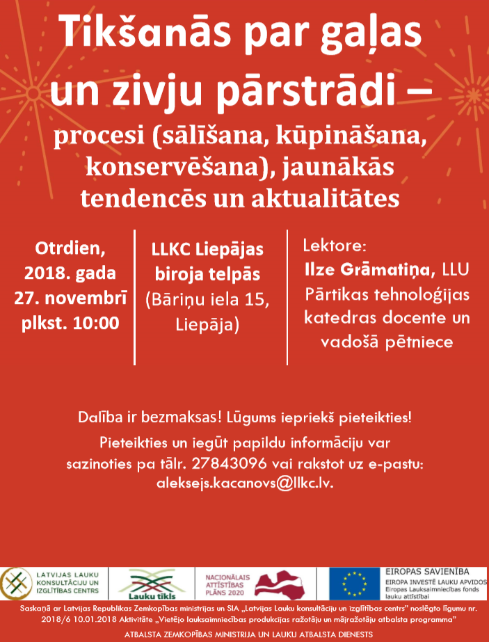 Ikviens interesents un īpaši mazie ražotāji (mājražotāji) un lauku saimniecības tiek aicināts uz tikšanos par gaļas un zivju pārstrādes procesiem (sālīšanu, kūpināšanu, konservēšanu), jaunākām tendencēm un aktualitātēm.