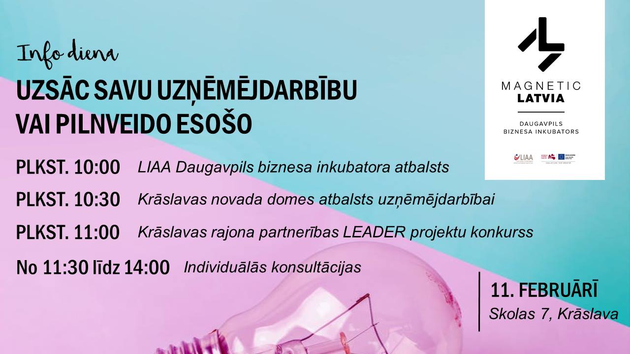 Ja vēlies uzsākt vai paplašināt savu uzņēmējdarbību, LIAA Daugavpils biznesa inkubators, Krāslavas novada dome un biedrība „Krāslavas rajona partnerība” aicina uz „Info dienu”. Tās laikā uzņēmēji un biznesa ideju autori varēs noskaidrot informāciju par konsultatīvo un finansiālo atbalstu biznesam, izmantojot biznesa inkubatora programmu, Krāslavas novada domes atbalstu uzņēmējdarbībai un Krāslavas rajona partnerības LEADER projektu konkursu.
