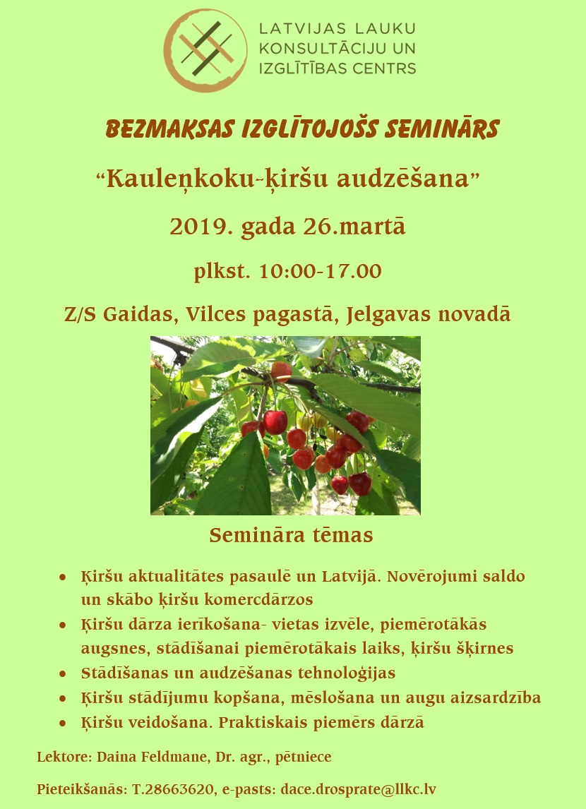 Datums: 26. Marts, 2019Reģions: ZemgaleVieta: Vilces pagastsAdrese: Skatīt karti lielākā izmērā Nozare: UzņēmējdarbībaKontaktinformācija: dace.drosprate@llkc.lvPielikums: PielikumsIzmērs kirsu_seminars_26.03.2019.jpg217.57 KB Kategorija: Lauku tīklsReģions filtram: Jelgavas novads