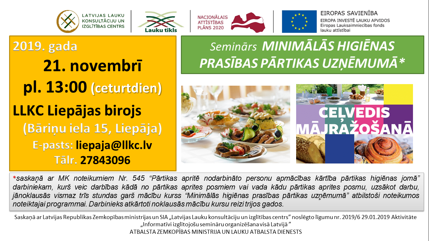 SIA "Latvijas Lauku konsultāciju un izglītības centrs" Liepājas birojs piedāvā semināru "Minimālās higiēnas prasības pārtikas uzņēmumā"*