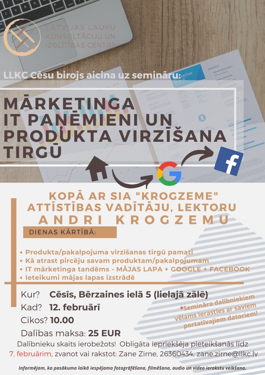 Ja Tev ir savs pakalpojums vai produkts, Tev noteikti ir arī vēlme paplašināt tā piedāvājumu. Kā atrast pircēju savam produktam/pakalpojumam, kādi ir veiksmīgākie paņēmieni tā virzīšanai tirgū? Kopā ar zinošu, pozitīvu un atraktīvu lektoru, SIA "Krogzeme" attīstības vadītāju, Andri Krogzemu radīsim atbildes, kā uz šiem jautājumiem, tā arī iepazīsim un izmēģināsim IT mārketinga piedāvātās iespējas. Un bez visa tā, lektors dalīsies vērtīgos ieteikumos mājas lapas izstrādē.