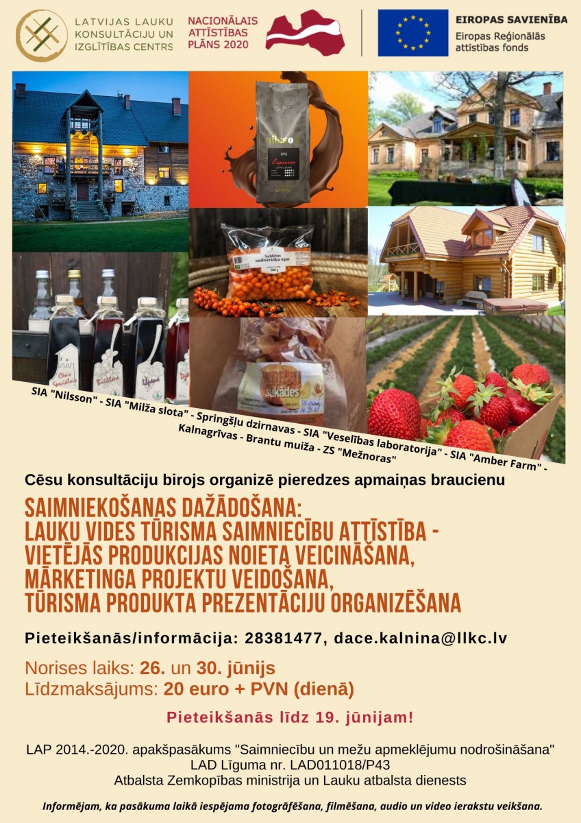 LLKC Cēsu konsultāciju birojs organizē divu dienu pieredzes apmaiņas braucienu 26. un 30. jūnijā. Apmeklējuma laikā pieredzē dalīsies dažādi vietējie ražotāji un tūrisma nozares pārstāvji.