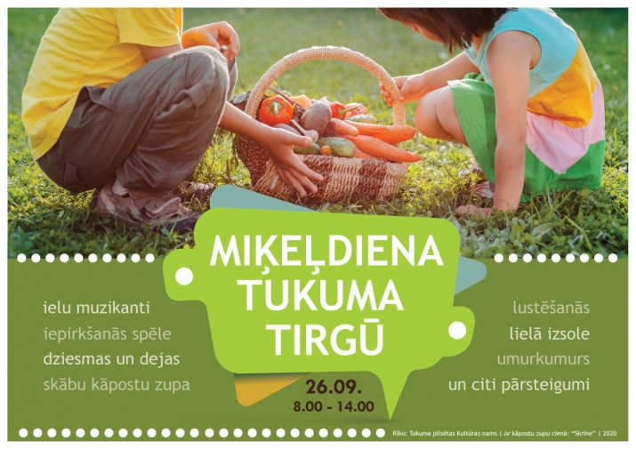 Sestdien, 26.septembrī uz Tukuma tirgu jādodas kā parasti – jau laicīgi, jo jau no pulksten 8.00 līdz tirgus beigām (pulksten 14.00) turpat tirgus placī jautras izdarības, ielu muzikantus, dziesmas un dejas, umurkumuru, ģimeņu iepirkšanās spēli, kā arī lielo izsoli turpat starp tirdziniekiem organizēs Tukuma pilsētas Kultūras nams. Neiztiks arī bez skābu kāpostu zupas un citiem pārsteigumiem. Vienvārdsakot, uz Tukuma tirgu jāiet iepirkties, izlustēties un sastapt Miķeli! Šajās brīvdienās iepirkšanās Tukuma tirgū būs citādāka!