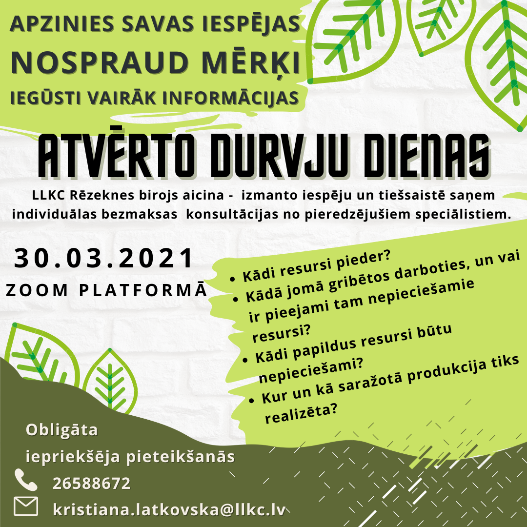 Ja plānojat uzsākt saimniekošanu, bet jūtat, ka nepieciešams plecs, uz kura atbalstīties, vai padoms, kurā ieklausīties, ir vērts griezties pēc profesionālas palīdzības interesējošās jomās. LLKC speciālisti var palīdzēt! Tā kā šogad nav iespējams interesentus uzņemt klātienē, Rēzeknes konsultāciju birojs rīko atvērto durvju dienas tiešsaistē. Rēzeknes konsultāciju birojā pasākums norisināsies 30. martā. Pasākuma mērķis ir sniegt individuālas konsultācijas esošajiem mazo saimniecību īpašniekiem, kuri plāno saimniecības attīstību un potenciālajiem mazo saimniecību īpašniekiem.