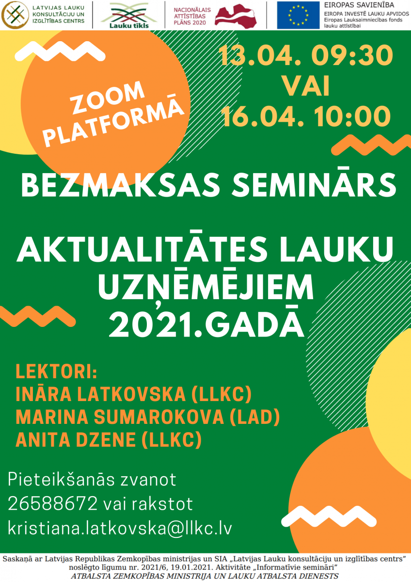 Seminārā informēsim par nodokļu izmaiņām, kas no šī gada 1. jūlija skars saimnieciskās darbības veicējus (pašnodarbinātos) - kā mainīsies valsts sociālās apdrošināšanas likmes un nomaksas kārtība? Kas ir minimālās sociālās iemaksas un kā rīkoties tiem, kam paredzami mazi ienākumi? Stāstīsim par pieteikšanos platību maksājumiem un izmaiņām šajā sezonā, kā arī par iespējām saņemt bezmaksas konsultācijas augkopības, lopkopības, ekonomikas un mežsaimniecības jomā – Kā pieteikties? Kādas konsultācijas var saņemt? Kādi ir konsultācijas saņemšanas nosacījumi?