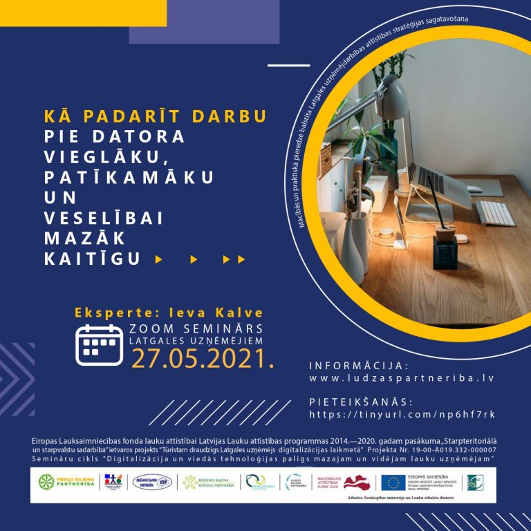 27.05.2021. norisināsies seminārs “Kā padarīt darbu pie datora vieglāku, patīkamāku un veselībai mazāk kaitīgu (ERGONOMIKA)”.