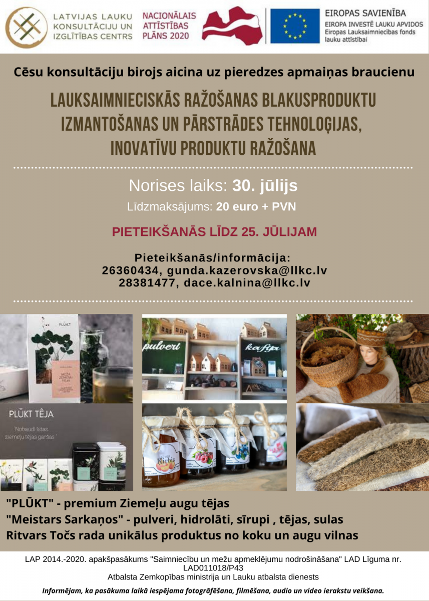 Informācija/pieteikšanās: Gunda Kazerovska, 26360434, gunda.kazerovska@llkc.lv vai Cēsu biroja vadītāja Dace Kalniņa, mob. 28381477, dace.kalnina@llkc.lv