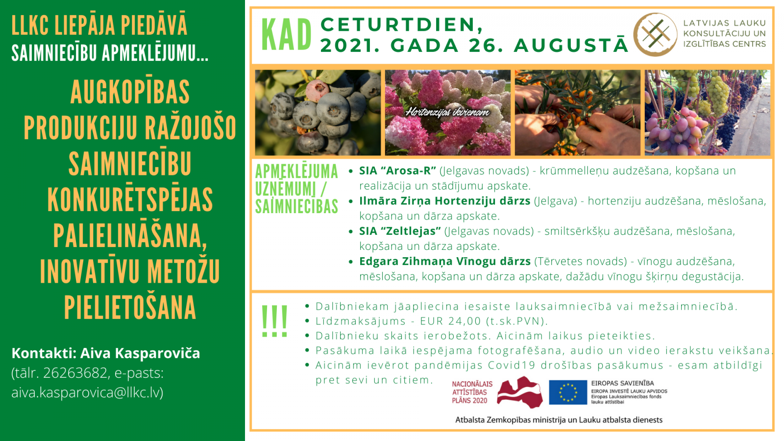 2021. gada 26. augustā LLKC Liepājas birojs piedāvā vienas dienas pieredzes apmaiņas braucienu “Augkopības produkciju ražojošo saimniecību konkurētspējas palielināšana, inovatīvu metožu pielietošana”.
