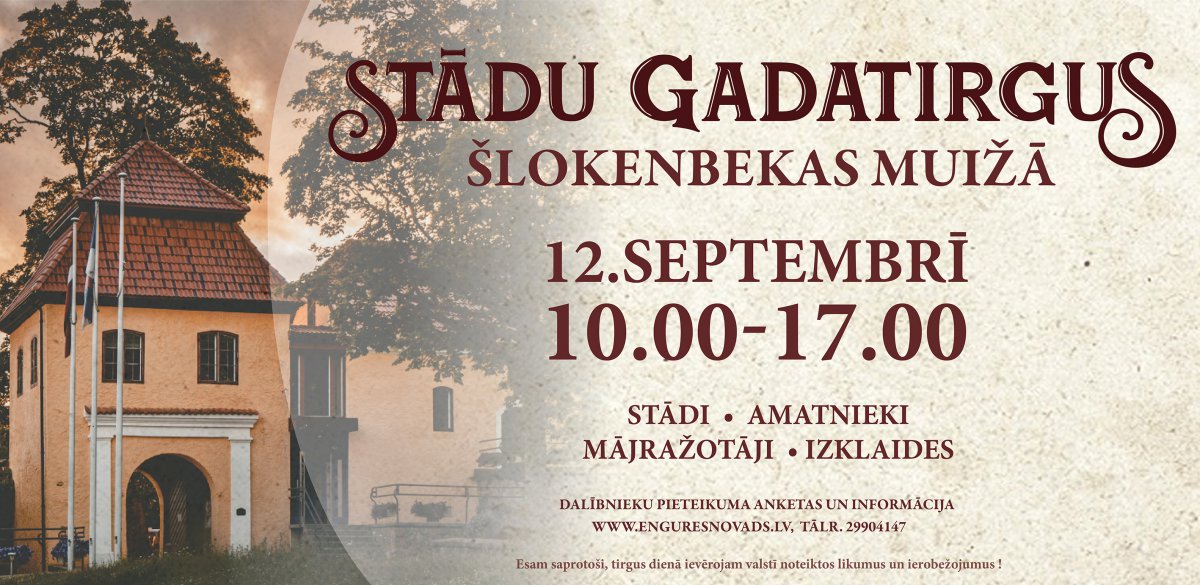 Datums: 12. Septembris, 2021Reģions: KurzemeVieta: Šlokenbekas muižas pagalmāAdrese: Skatīt karti lielākā izmērā Nozare: UzņēmējdarbībaKontaktinformācija: T. 29904147 - Gunita BērziņaPielikums: PielikumsIzmērs list-thumb-c30da808-6c32-b9a7.jpg187.83 KB Reģions filtram: Tukuma novads