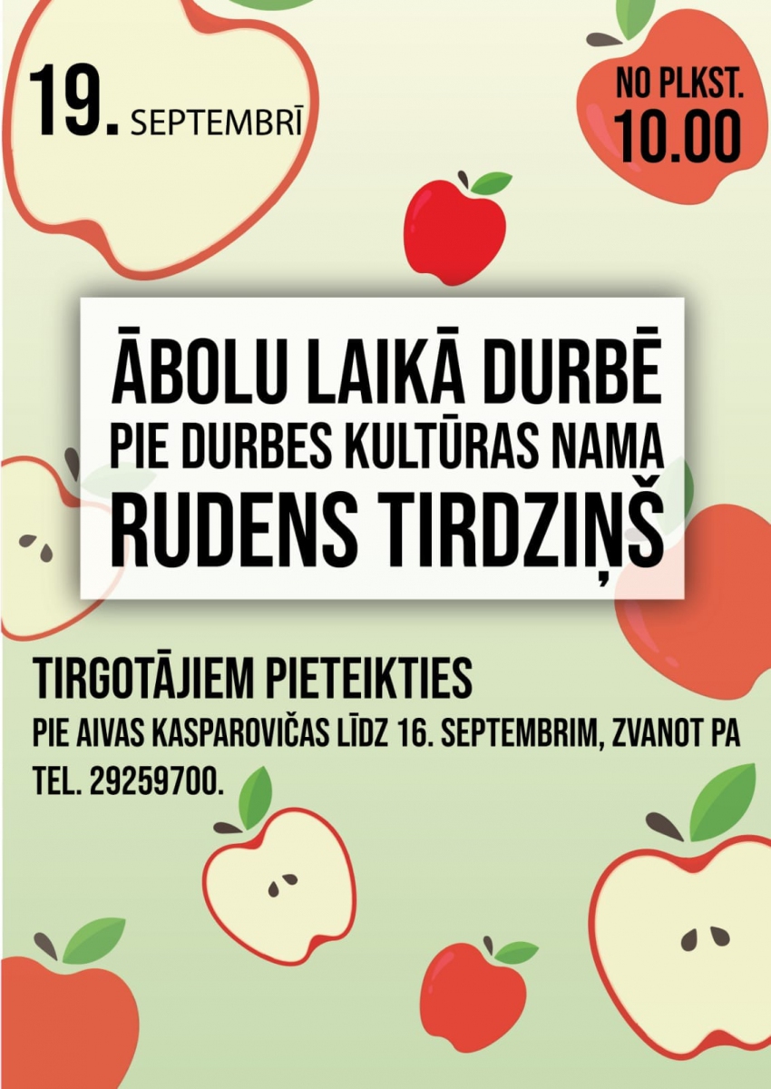 2021. gada 19. septembrī no plkst. 10.00 ābolu laikā Durbē pie Durbes kultūras nama RUDENS TIRDZIŅŠ.