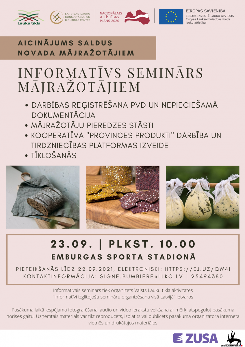 LLKC Saldus konsultāciju birojs, sadarbībā ar kooperatīva “Provinces labumi” pārstāvēm Agnesi Arni - Štenceli un Anetu Rulli, aicina Jūs apmeklēt informatīvo semināru mājražotājiem, kas tiek organizēts Valsts Lauku tīkla pasākuma ietvaros.