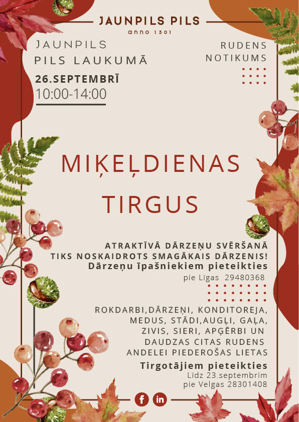 26. septembrī no plkst. 10:00 līdz 14:00 Jaunpils pils pagalmā Miķeļdienas tirgus!