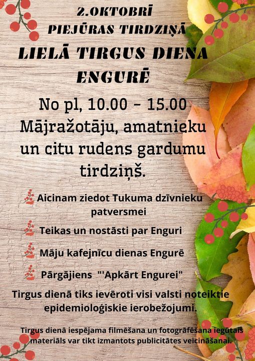 2. oktobrī no plkst. 10:00 līdz 15:00 Engures Piejūras tirdziņā Lielā tirgus diena.