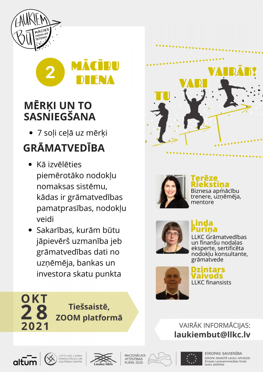 • LLKC Grāmatvedības un finanšu nodaļas eksperte, sertificēta nodokļu konsultante un sertificēta grāmatvede Linda Puriņa palīdzēs saprast, kā izvēlēties piemērotāko nodokļu nomaksas sistēmu, kādas ir grāmatvedības pamatprasības un kādi ir nodokļu veidi, savukārt, LLKC finansists Dzintars Vaivods parādīs sakarības, kurām būtu jāpievērš uzmanība jeb liks uz grāmatvedības datiem paskatīties no uzņēmēja, bankas un investora skatu punkta.