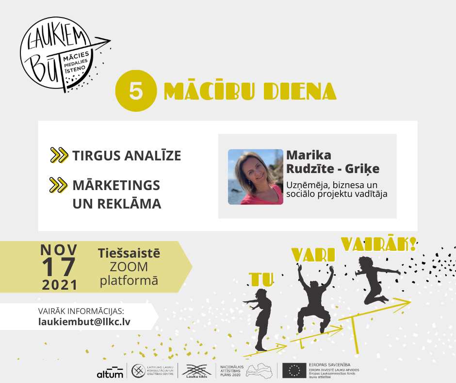 Mācību jauniešiem, jaunajiem uzņēmējiem un jaunienācējiem laukos “Laukiem būt!” 5. mācību diena. Mācību dienas tēmas - sava mērķa klienta (mērķauditorijas) noteikšana, savu unikālo priekšrocību atrašana un izcelšana konkurences apstākļos, konkurentu un sadarbības partneru apzināšana, būtiskāko risku noteikšana, izvērtēšana, paredzēšana un sevis aizsargāšana, kā arī mārketinga būtība, reklāmas loma mārketinga procesā un mūsdienās ieteicamākie mārketinga veidi. Organizē LLKC Lauku attīstības nodaļa.