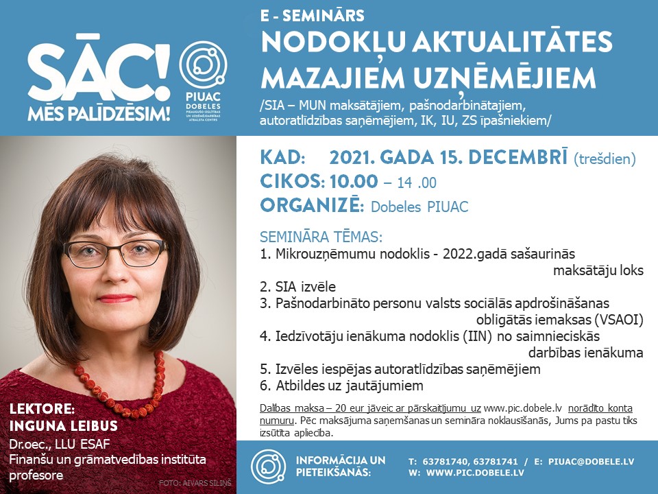 Tiešsaistes seminārs “Nodokļu aktualitātes mazajiem uzņēmējiem (SIA – MUN maksātājiem, pašnodarbinātajiem, autoratlīdzības saņēmējiem, IK, IU, ZS īpašniekiem)”