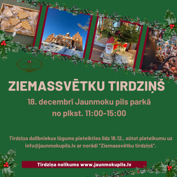 Jaunmoku pils aicina dāvanas saviem mīļajiem un gardumus svētku galdam iegādāties no amatniekiem, mājražotājiem, mazajiem uzņēmējiem, kas paši radījuši skaistas, praktiskas un gardas lietas Ziemassvētku tirdziņā pils parkā!