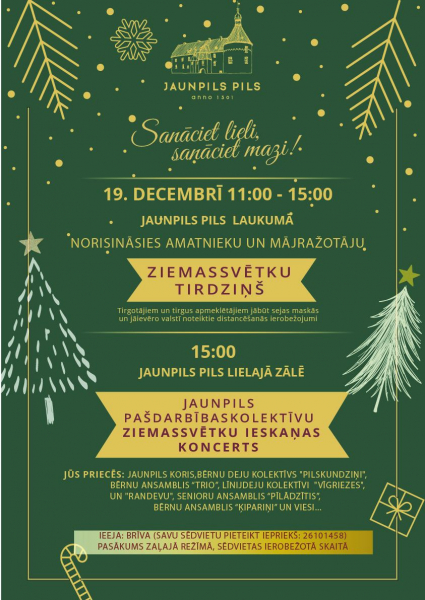 19. decembrī 11:00 - 15:00 amatnieku un mājražotāju Ziemassvētku tirdziņš.
