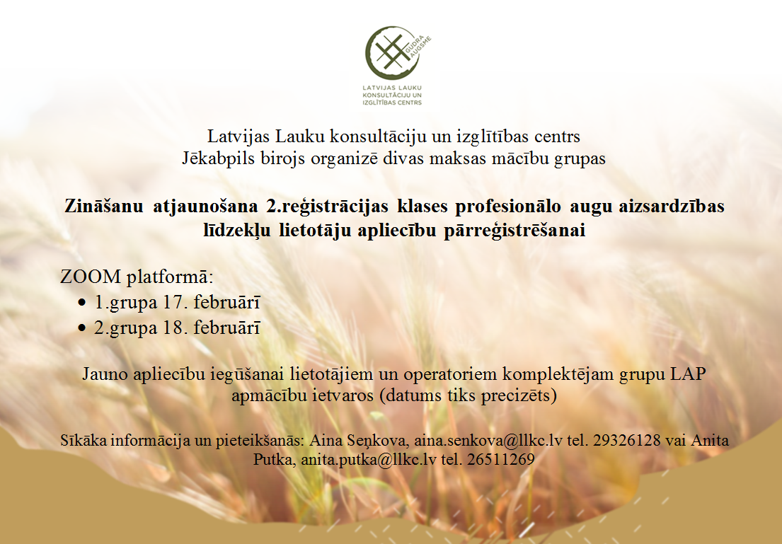 LLKC Jēkabpils birojs organizē divas maksas mācību grupas "Zināšanu atjaunošana 2.reģistrācijas klases profesionālo augu aizsardzības līdzekļu lietotāju apliecību pārreģistrēšanai".