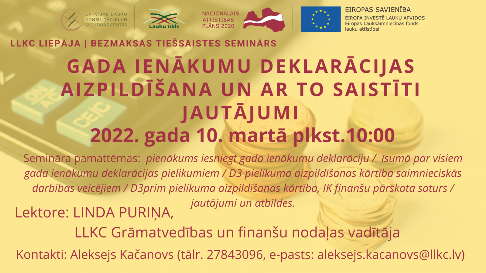 LLKC Liepājas birojs piedāvā bezmaksas tiešsaistes informatīvo semināru Valsts lauku tīkla ietvaros "GADA IENĀKUMU DEKLARĀCIJAS AIZPILDĪŠANA UN AR TO SAISTĪTI JAUTĀJUMI".