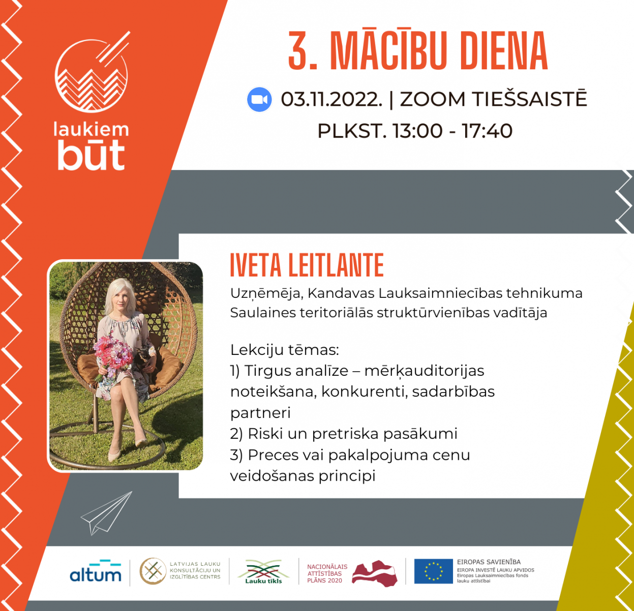 Tiešsaistes nodarbība ZOOM platformā* 3. novembrī laikā no plkst. 13.00 līdz 17.40.